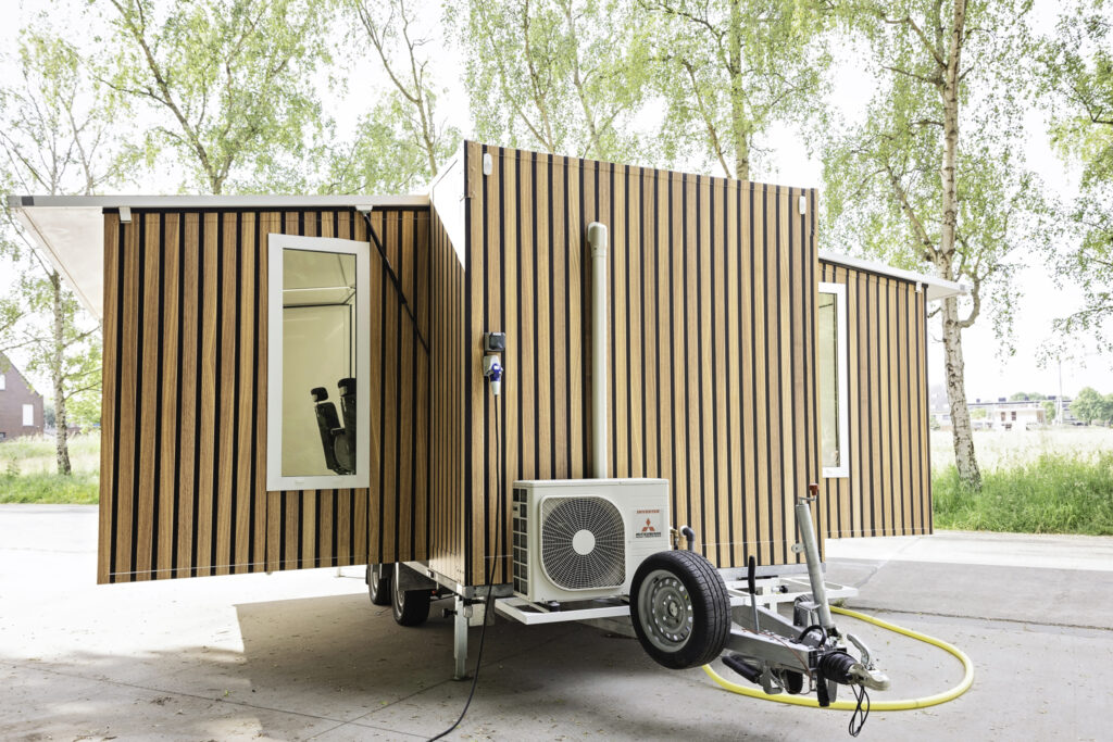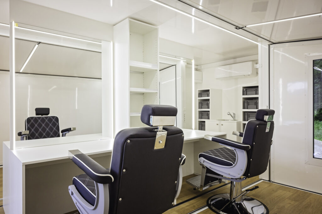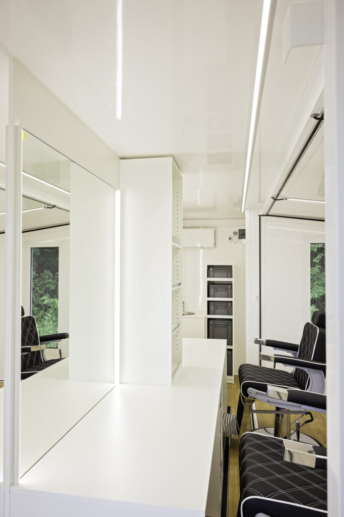 De haar & make-up trailer is ontworpen met het oog op functionaliteit en comfort. De ruimte is voorzien van 4 comfortabele stoelen en spiegels met ledverlichting. Daarnaast biedt het voertuig ook voldoende opbergruimte voor producten en apparatuur, waardoor alles georganiseerd en binnen handbereik blijft voor het hele team.