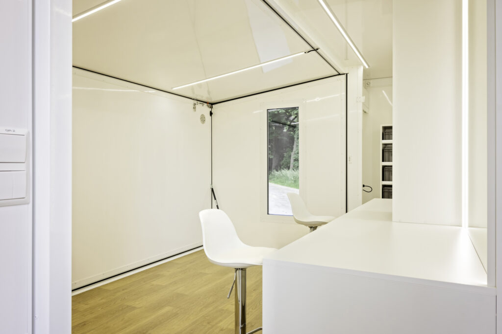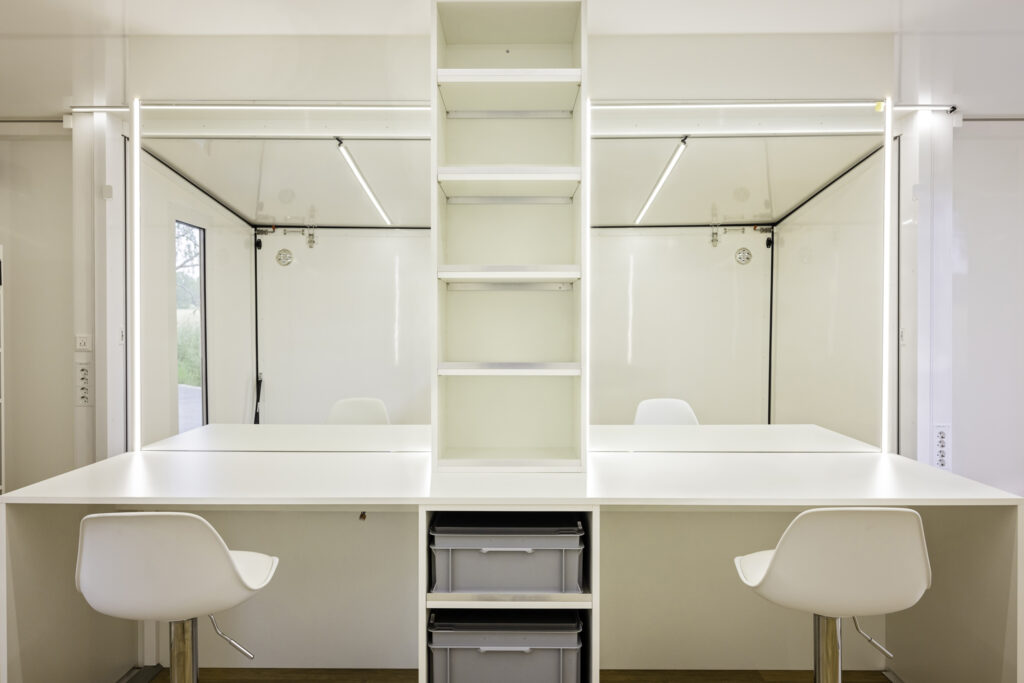 De hair & make-up loge voor vier personen kan gemakkelijk op locatie worden geplaatst en is uitgerust met alle benodigde faciliteiten. Er is voldoende stroomvoorziening en verlichting, evenals een wateraansluiting en wasgelegenheid voor het gemak van de stylisten. Het voertuig is zo ontworpen dat het een efficiënte en georganiseerde ruimte biedt voor het hele team.